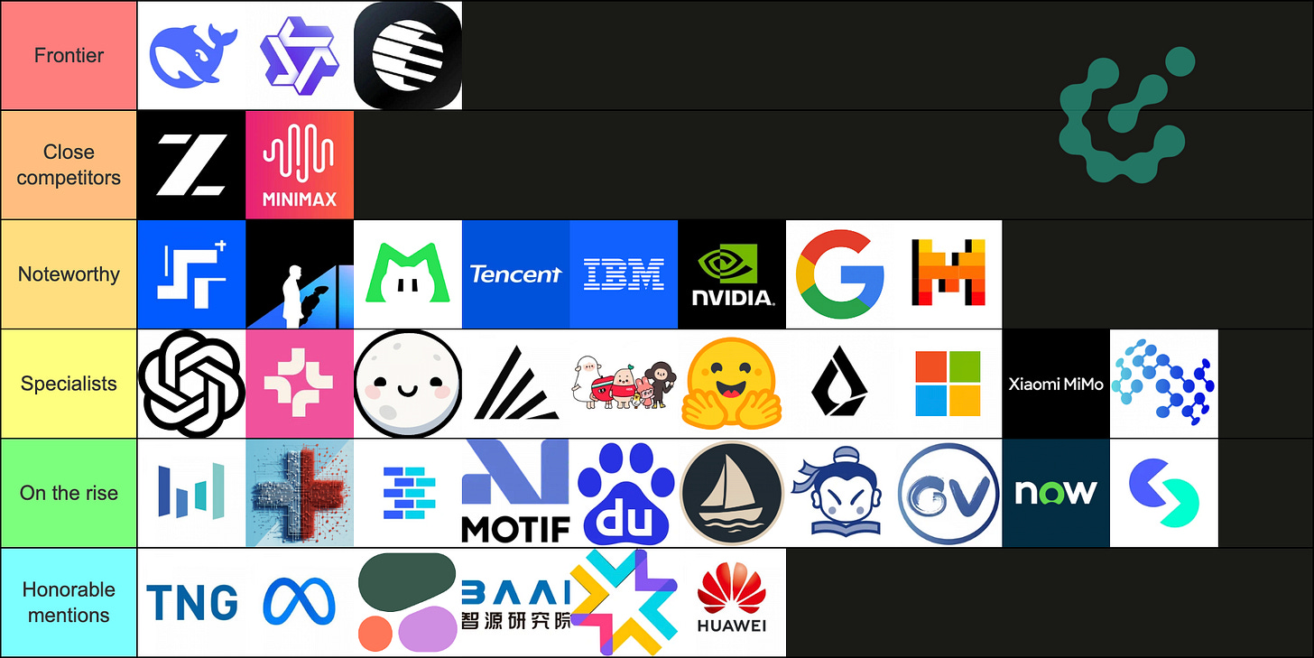 We have more requests than imagined to update our tier list, which covered the Chinese ecosystem and to extend it with Western orgs, which we’ve covered here. We have added a specialist tier which contains the organizations that trained few models or are specializing in a certain niche, e.g. small, on-device models (Liquid, HuggingFace).