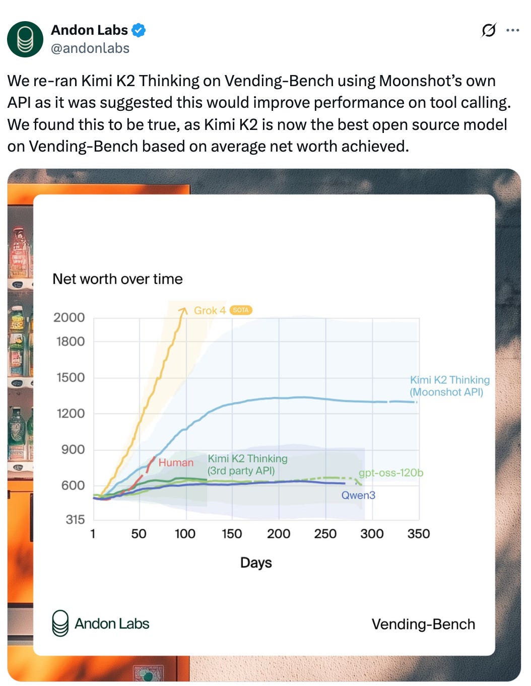 Kimi-K2-Thinking by moonshotai (more coverage here): The best open model, competitive with some of the best closed models. However, independent evaluation is a problem as third-party API providers struggle to implement the model correctly, something which we have seen, for example, with the release of GPT-OSS. As an example, running the agentic “Vending-Bench” from Andon Labs with a third party provider as opposed to the official API makes a huge difference: