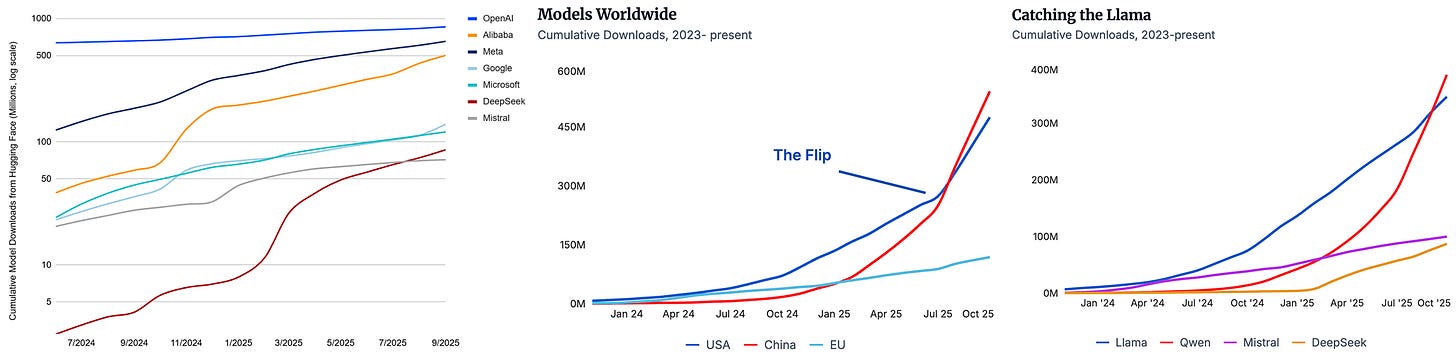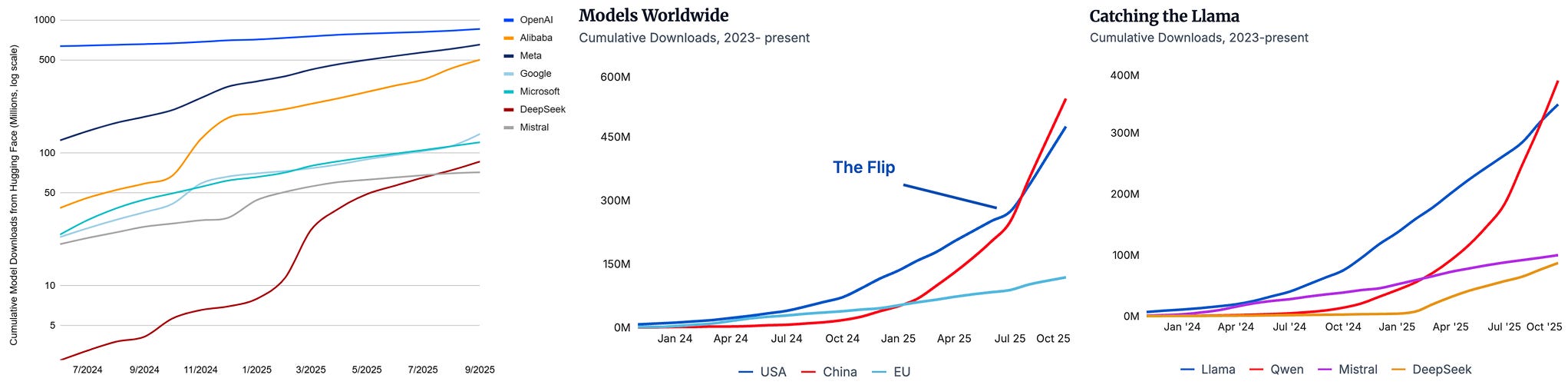 In short, it depends on which data you look at and how you clean it. For ATOM Project, we only consider models which were released after ChatGPT and are LLMs (based on our assessment). This excludes models like GPT-2 (which is the reason why OpenAI trumps all in the CAISI number, left), BERT-like models and ViTs like SigLIP (which are dominating the Google download numbers).