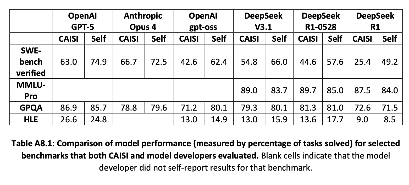 First, the Center for AI Standards and Innovation (CAISI) released a report that observed the ecosystem and evaluated DeepSeek 3.1 against leading closed models. The evaluation scores they highlighted show some discrepancy with accepted results in the community. While MMLU-Pro, GPQA and HLE are close to the self-reported scores from DeepSeek and within usual error bars1, the SWE-bench Verified scores are off by a wide margin due to a weak harness for the benchmark. The harness is the software framework the model is used in for agentic benchmarks and has as great an impact as the model itself, as shown in this SWE-bench analysis by Epoch AI.