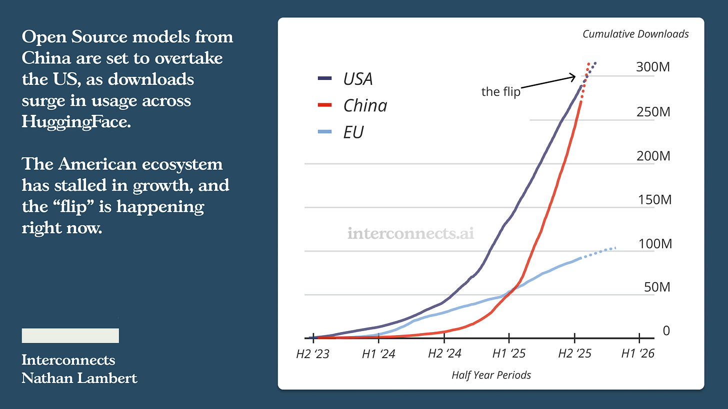 These realities all paint a clear picture that bends the association of open models from “soft power” to just “power.” Continuously releasing strong open AI models could allow Chinese companies to shape the technology interfaces, services and reality around the world. Where 2024 was about research on open models, and 2025 the professionalization of them, 2026 could be where we begin to see clear impacts of their power through endless distribution.