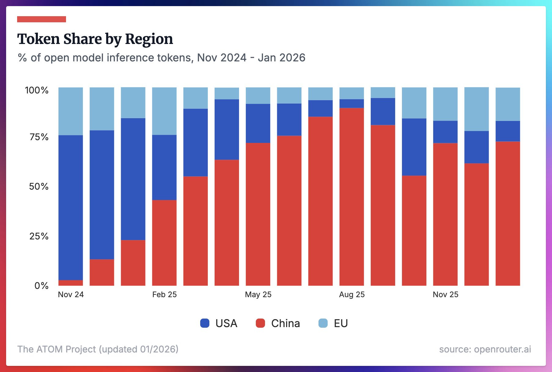 Here’s some new data on open model usage courtesy of OpenRouter, which largely mirrors the adoption trends we’ve been seeing. While HuggingFace downloads are obviously very noisy, almost every other adoption metric over time looks strongly correlated with them, especially on U.S. vs. China issues.