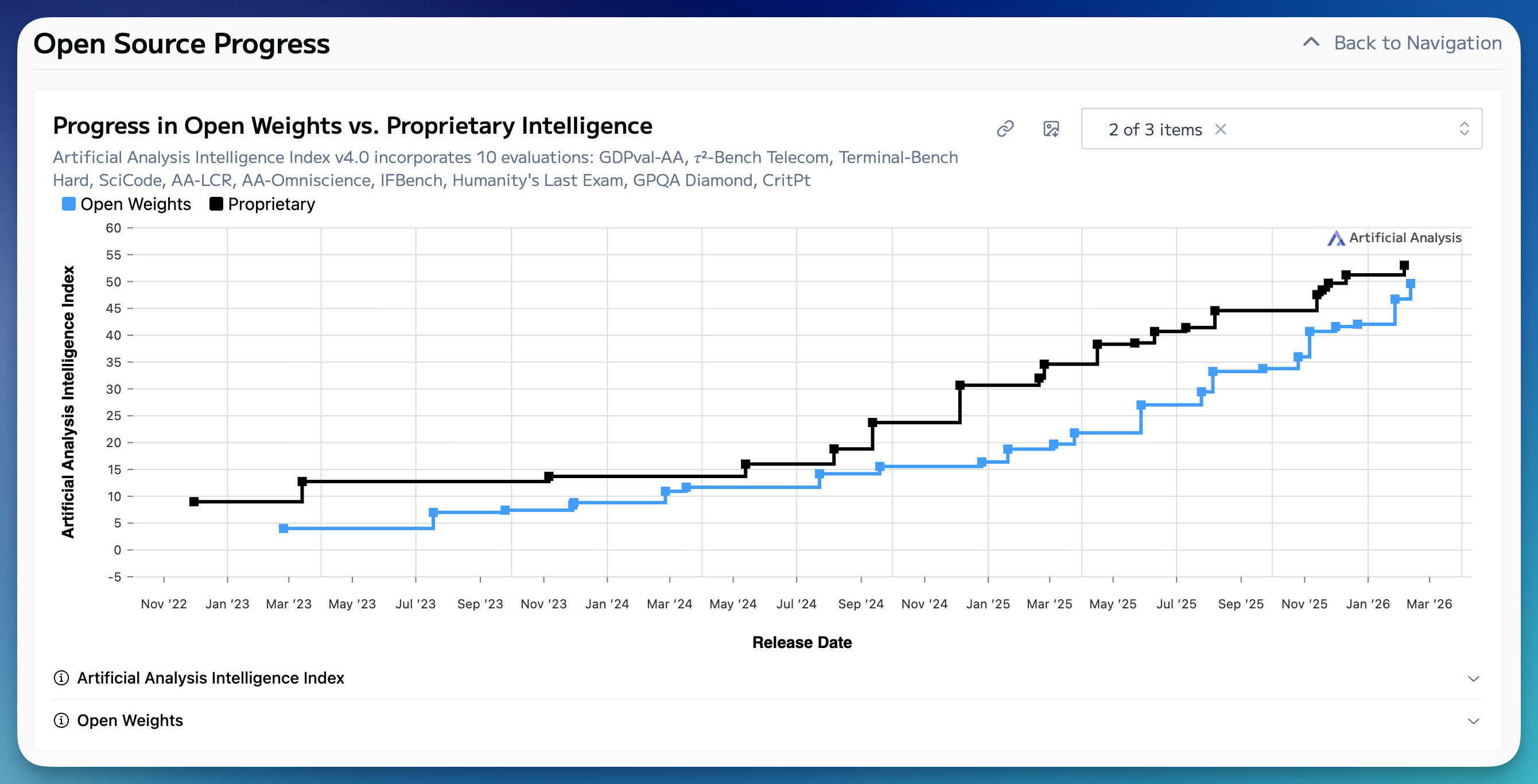 The plot of the day is ArtificialAnalysis Intelligence Index for open vs. closed models over time. The point of this post isn’t to nitpick this index’s many limitations, or any other, but to reflect on what this chart doesn’t represent and what it means for the AI world for open weights to keep pace year in and year out.